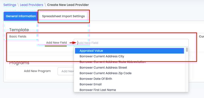 6. Click Spreadsheet Import Settings and add new fields by selecting them from the Add New Field dropdown.