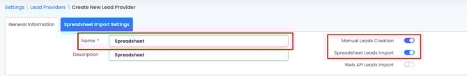 5. Enter the lead provider Name and flip on the Manual Leads Creation and Spreadsheet Leads Import toggles.