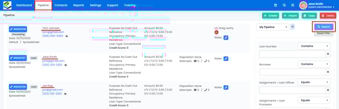12. To view the files that have been imported, go to Pipeline and click Search. You should begin to see the files from your spreadsheet.