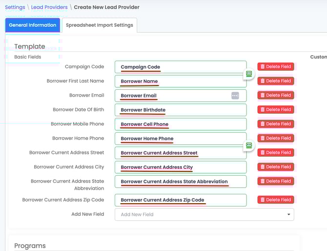 Basic Field names added MUST match with your spreadsheet's column names and be in the same order as well. Please note, Campaign Code MUST be the first Basic Field in LendingPad and in your spreadsheet.