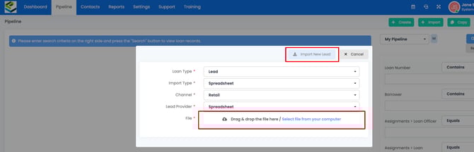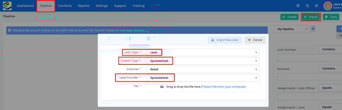 10. To import your spreadsheet, click Pipeline, then click + Import. Set the Loan Type to Lead, Import Type to Spreadsheet and Lead Provider to the name of the lead provider you created.