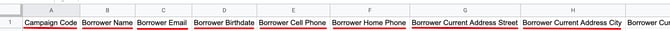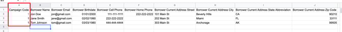 9. In your spreadsheet, you MUST add the Code in the first column (Campaign Code) of your spreadsheet and enter the other client data that you want to import into LendingPad. If any fields do not apply, you can leave them blank (as you see for the Borrower Home Phone).